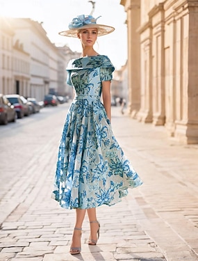 Платье для вечеринки длины чай A-Line коктейльное платье платье для гостей на свадьбу платье для матери невесты короткий рукав элегантное винтажное формальное платье с складками и цветком