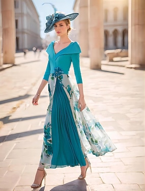 А-силуэт До щиколотки Платье для вечеринки Свадебное платье для гостей Платье Дерби Платье для матери невесты Рукав 3/4 V-образный вырез Элегантный стиль Официальные Свадебный гость Дерби в Кентукки