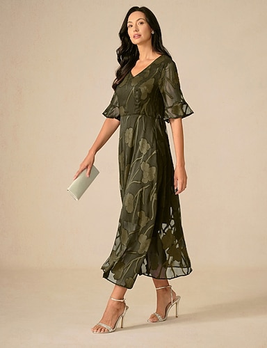 Жен. Платье средней длины Шифоновые платья Элегантный стиль Рукава-крылышки Отпуск Свадебный гость Свидание Карман Иллюзионное кружево Стандартный Цветочный принт Рукав до локтя V-образный вырез
