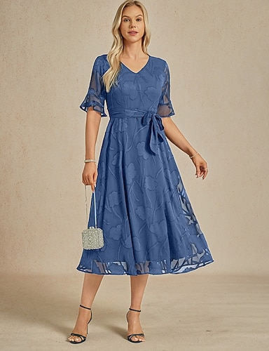 женское платье миди с v-образным вырезом, кружевной отделкой, коротким рукавом, шифоновое, струящееся, синее, элегантное, вечернее, для вечеринки, свадьбы, для гостей, весна, лето, осень,
