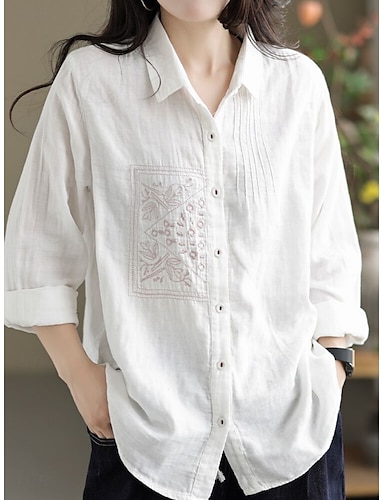Жен. Рубашки из хлопка и льна Сплошной цвет Винтаж Классический На каждый день Длинный рукав Рубашечный воротник Обычные топы Повседневные Вышивка Карман Пуговицы Белый Желтый Зеленый Лето Весна Осень