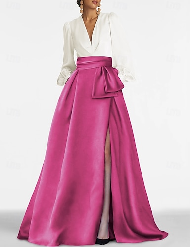 А-силуэт Вечернее Платье Элегантное платье Формальное Гость на свадьбу Сметанная  Щеткой Пояс Длинный рукав V-образный вырез Атлас с Плиссировками Разрез