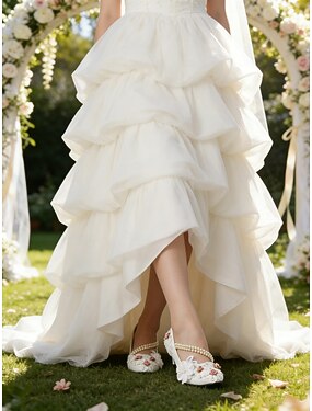 Женские туфли на платформе и шпильке цвета слоновой кости, украшенные жемчугом — элегантные свадебные туфли для невест, желающих сыграть свадьбу в саду.
