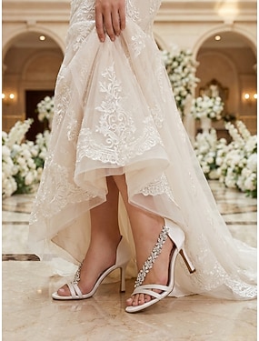 Женские босоножки на высоком каблуке цвета слоновой кости — элегантные свадебные туфли с кристальным ремешком для городских свадеб.