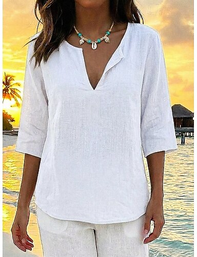 Жен. Рубашка Рубашки из хлопка и льна Полотняное плетение Повседневные Стиль Классический Рукав 3/4 V-образный вырез Обычные топы Повседневные Офис Праздники Синий Черный Белый Весна Осень