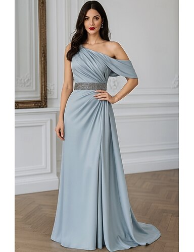 А-силуэт В пол коктейльные платья Вечернее платье Платья для вечеринок Элегантный стиль Винтаж Блестящая Длинный рукав На одно плечо Официальные Свадьба Карман Сатин Стретч-креп с Рюши