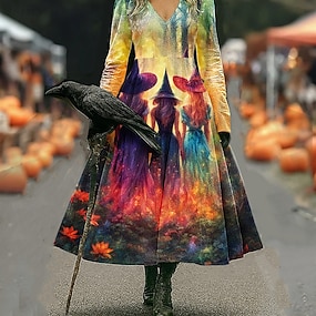 Платье миди с графикой ведьмы для женщин А-силуэта отпуск повседневное ежедневное регулярный крой флоральная графика Хокус Покус длинный рукав V-образный вырез черный красный коричневый весна осень