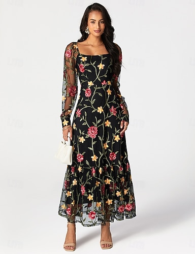 Жен. Длинное платье Черное платье Элегантный стиль Рукава буффы Отпуск Свободное облегание Цветочный принт Длинный рукав Квадратный вырез Черный Лето