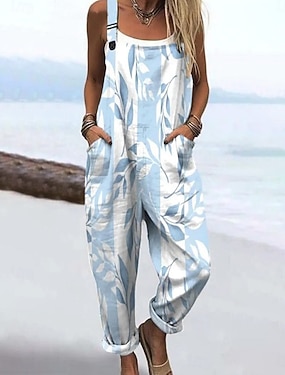 Жен. Нормальная Комбинезоны Праздник Цветочный принт Без рукавов V-образный вырез Открытая спина Карман Для улицы Повседневные Стандартный Синий Лето