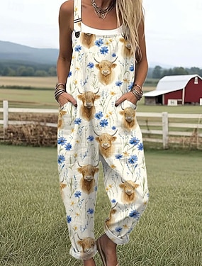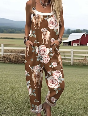 Жен. Нормальная Комбинезоны Уличный стиль Цветочный принт Без рукавов U-образный вырез С принтом Для улицы Повседневные Стандартный Хаки Серый Лето