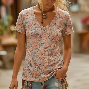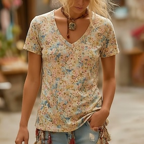 Жен. Футболка С принтом Цветочный принт Графика Богемия Винтаж На каждый день С короткими рукавами V-образный вырез Обычные топы Повседневные Желтый Красный Лиловый Зеленый Лето Весна