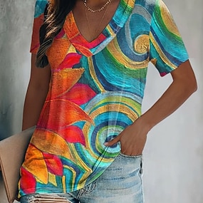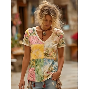 Жен. Футболка С принтом Цветочный принт Контрастных цветов Винтаж На каждый день Богемный С короткими рукавами V-образный вырез Обычные топы Повседневные Цвет радуги Лето Весна