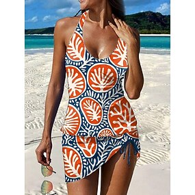 Женский танкини 2-х предметный купальник с юбкой Юбка Без спинки Отпуск Пляжная одежда Цветочная Графика V-образный вырез Без рукавов