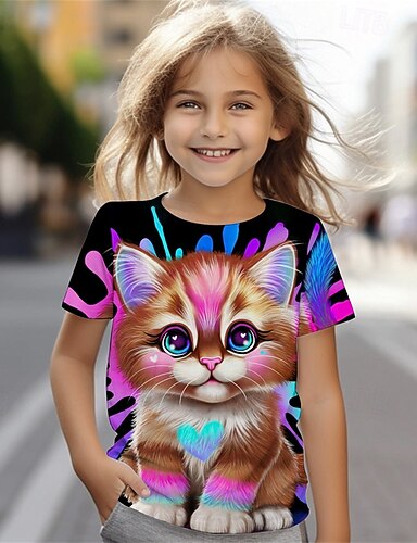 Девочки 3D Кот Футболка С короткими рукавами Лето Весна Мода Классический Дети 4-12 лет Вырез под горло на открытом воздухе Повседневные Стандартный