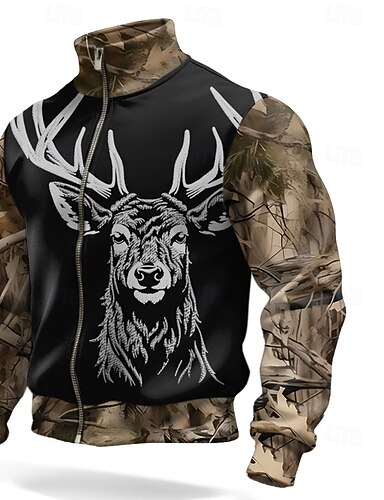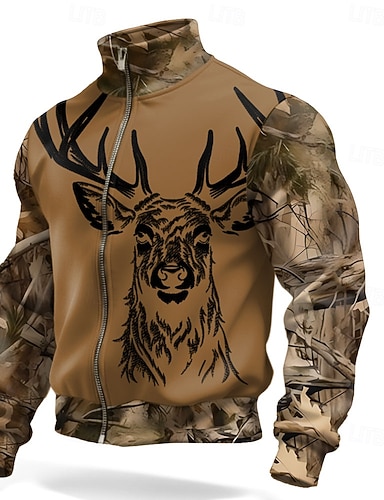 Муж. Толстовка Толстовка с застежкой-молнией Черный Темно синий Коричневый Серый Половина молния Северный олень С принтом Рождество Повседневные Праздники Полиэстер