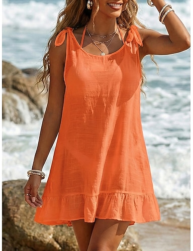 Жен. Мини-платье Искусственный хлопок и лен Летнее платье Классический Пляж Свободное облегание Чистый цвет Без рукавов Вырез под горло Большой красный Мармелад красный Lake Green Черный Лето