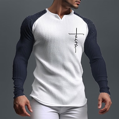 Муж. Футболка Длинный рукав V-образный вырез Лето Весна Полотняное плетение Мода Оригинальный рисунок Легкие Классический Мягкий Отпуск Для улицы На выход Черный Небесно-голубой Лиловый