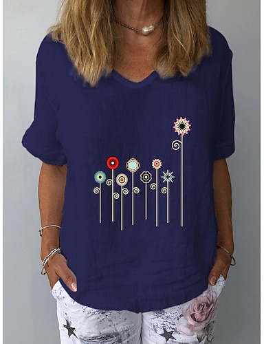 Жен. Футболка С принтом Цветочный принт Графика Винтаж Стиль Классика С короткими рукавами V-образный вырез Обычные топы Повседневные Для спортивного зала На выход Синий Лето Весна