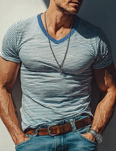 Мужская футболка сине-белого цвета с тонкими горизонтальными полосками, однотонная синяя, V-образный вырез, винтажный ретро-стиль, морской пляжный летний эстетический дизайн, принт по всей