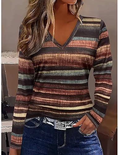 Жен. Футболка Графика Геометрический принт Полоски Винтаж Стиль Классика Длинный рукав V-образный вырез Обычные топы Повседневные С принтом Коричневый Осень Зима