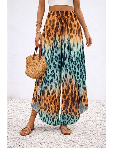 Жен. Широкие Брюки Отпуск Мода Стиль Полная длина Завышенная Графика Леопард Неэластичная Повседневные Отпуск Официальные Синий Лето Весна Осень Зима Свободное облегание