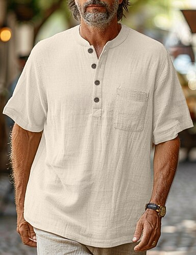 Муж. Рубашка Хлопково-льняная рубашка Белая хлопковая рубашка Рубашка с китайским воротником Рубашка с воротником-стойкой Повседневная рубашка Полотняное плетение Отпуск Гавайский