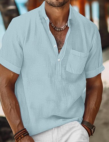 Муж. льняная рубашка Рубашка с воротником-стойкой Повседневная рубашка Полотняное плетение Отпуск Гавайский Черный Белый Желтый Розовый С короткими рукавами Хенли Весна лето Одежда Передний карман