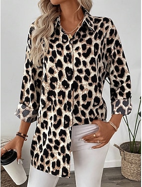 Женская рубашка с пуговицами туника воротник длинный рукав графика леопардовая винтажная повседневная стильная обычные топы повседневные праздничные с принтом коричневый весна