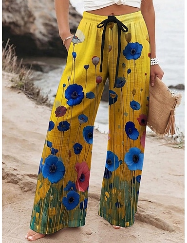 Жен. Широкие Брюки Отпуск На каждый день Длиные Завышенная Цветочный принт Эластичная талия Рисунок Высокий вырез Воздухопроницаемость Мягкий Слабоэластичная Отпуск Для улицы На каждый день Желтый