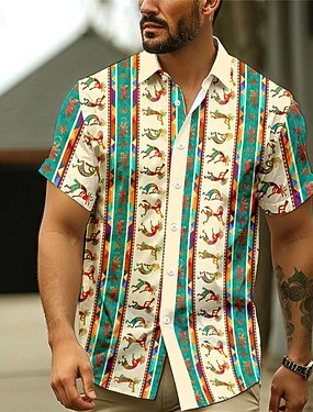 Муж. Этно Этнический Бандана с принтом Рубашка Кнопка рубашка С короткими рукавами Винтаж Туземные на открытом воздухе Для улицы На каждый день Осень Отложной Пуговицы С принтом