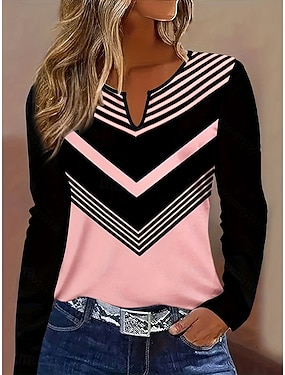 Жен. Футболка Омбре Графика Полоски Винтаж Стиль Классика Длинный рукав V-образный вырез Зубчатая шея Обычные топы Повседневные выходные С принтом Розовый Небесно-голубой Хаки Весна Осень