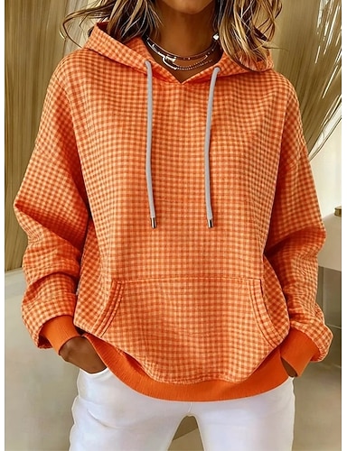 Жен. Толстовка с капюшоном и пуловером Графика В клетку Корова Панк Активный Винтаж Длинный рукав Капюшон Обычные топы Для улицы На каждый день Повседневные С принтом Передний карман Оранжевый
