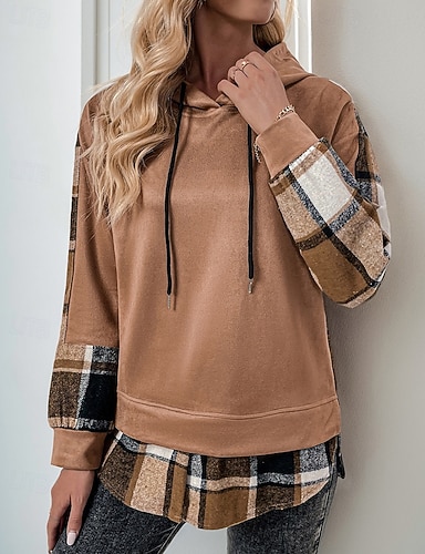 Жен. Толстовка с капюшоном и пуловером В клетку Винтаж На каждый день Длинный рукав Капюшон Обычные топы Для улицы Повседневные Спорт Кулиска Пэчворк