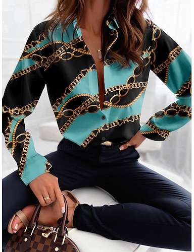 Жен. Рубашка Геометрический принт Повседневные Стиль Классический Длинный рукав Рубашечный воротник Обычные топы Повседневные Праздники Пуговицы С принтом Черный Тёмно-синий Синий Лиловый Зеленый