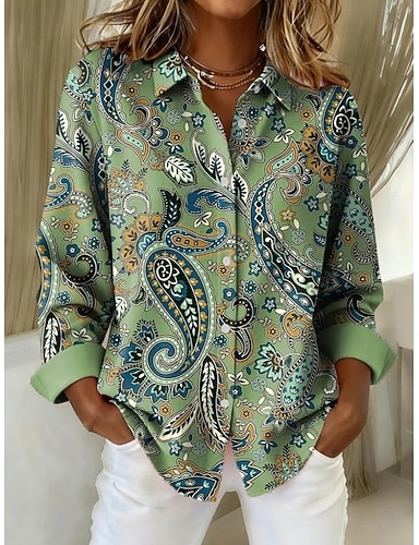 Жен. Рубашка Блуза Графика Геометрический принт Огурцы Богемия Винтаж тропический Длинный рукав Рубашечный воротник Обычные топы Повседневные Пэчворк Пуговицы С принтом Оранжевый Зеленый Хаки