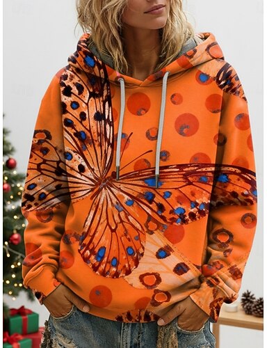 Жен. Pullover Худи Цветочный принт Бабочка Мода Уличный стиль На каждый день Длинный рукав Капюшон Обычные топы На каждый день Повседневные Кулиска С принтом Оранжевый Зеленый Весна Осень Зима