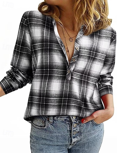 Жен. Блуза Нарядные Топы В клетку Полотняное плетение Элегантный стиль Винтаж Стиль Длинный рукав V-образный вырез Обычные топы Офис Повседневные Праздники Пуговицы