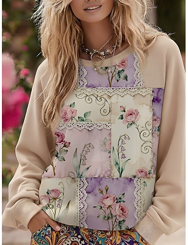 Жен. Pullover Толстовки Цветочный принт Мода Уличный стиль Классика Длинный рукав Круглый вырез Обычные топы На каждый день Повседневные С принтом Лиловый Весна Осень