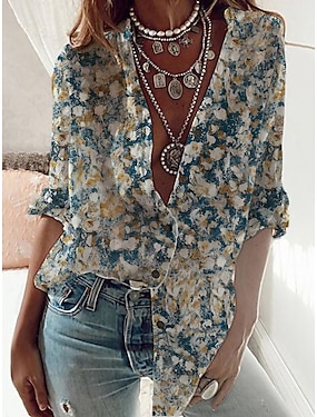 Женская рубашка туника Уличная мода Повседневная Цветочная Печать на кнопках с длинным рукавом Обычные топы Ежедневные выходные Синий Весна Осень