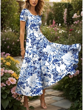 Женское макси платье повседневное платье шифоновое платье длинное платье белое синее зеленое короткий рукав цветочный принт весна лето круглый вырез базовое ежедневное отпуск летнее платье 2023 S M L