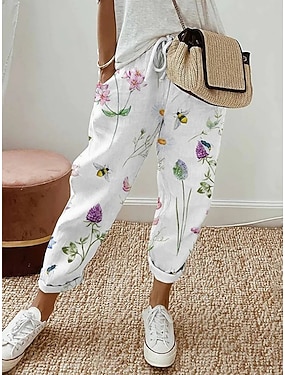 Жен. Чино Брюки Активный На каждый день Длиные Завышенная Цветочный принт Карман Рисунок Эластичный шнурок Воздухопроницаемость Мягкий Слабоэластичная Отпуск Для улицы На каждый день Белый Весна Осень