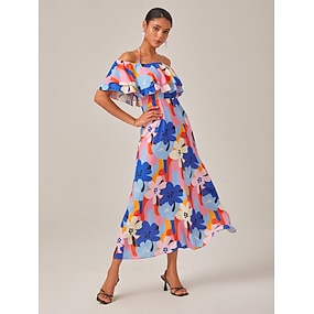 Жен. Длина чая Шифоновые платья Элегантный стиль Расклешенный рукав Отпуск Повседневные Свидание Стандартный Цветочный принт С короткими рукавами V-образный вырез Темно-синий Лето