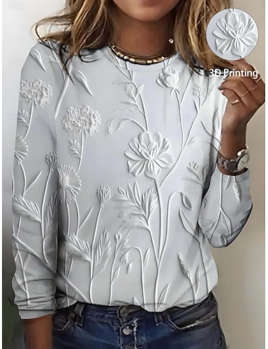 Женская футболка Длинный рукав Круглый вырез Длинный рукав Туника 3D Принт Цветы Кэжуальная Круглый вырез Обычные топы Уикенд Принт Перл Розовый Синий Фиолетовый Зеленый Осень Зима Предосень