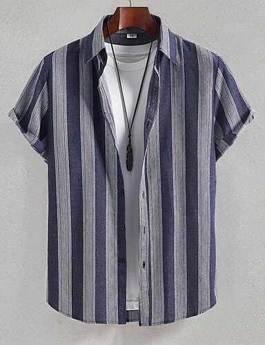 Муж. Рубашка Летняя рубашка Повседневная рубашка Пляжная рубашка Кнопка рубашка Полосатые рубашки Темно синий С короткими рукавами В полоску Отложной Отпуск Гавайский Одежда Полиэстер