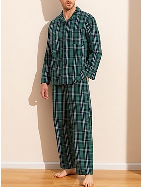 Муж. Домашняя одежда Пижамы пижама Пижамный топ и брюки 2 предмета В клетку Стиль На каждый день Удобная обувь Дом Повседневные Хлопок Комфорт Лацкан Длинный рукав Рубашка Брюки