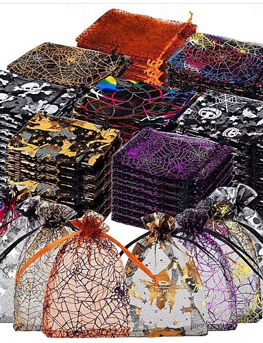 100 шт./комплект подарочных пакетов для вечеринки на Хэллоуин со шнурком, 4x6 дюймов, маленькие фатиновые пакеты для конфет и закусок, подарки для вечеринки (тыква, паутина, череп, летучая мышь) -