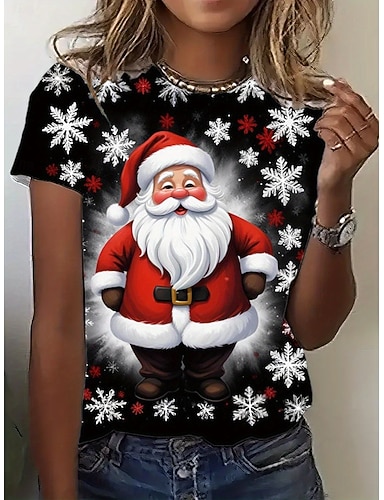 Новогодняя тематика Жен. Футболка Графика Дед Мороз Винтаж Стиль Классика С короткими рукавами Вырез под горло Обычные топы Повседневные С принтом Черный Лето Весна Зима