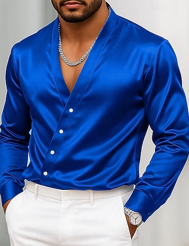Муж. Рубашка Атласная рубашка Повседневная рубашка Кнопка рубашка Выпускная рубашка Полотняное плетение Официальные Свадьба Черный Белый Насыщенный синий Золотой Длинный рукав V-образный вырез