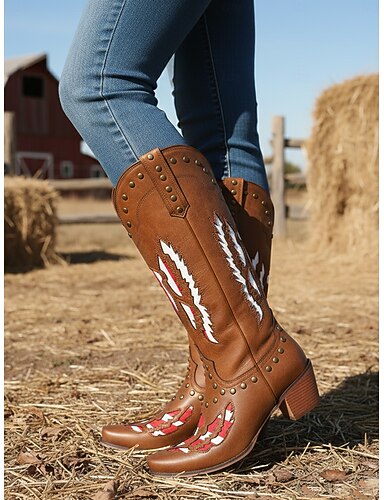 Женские ковбойские сапоги в стиле вестерн с вышивкой, черно-красного цвета, с отделкой заклепками, идеально подходят для фестивалей в стиле холлоуин, кантри-концертов и повседневных образов