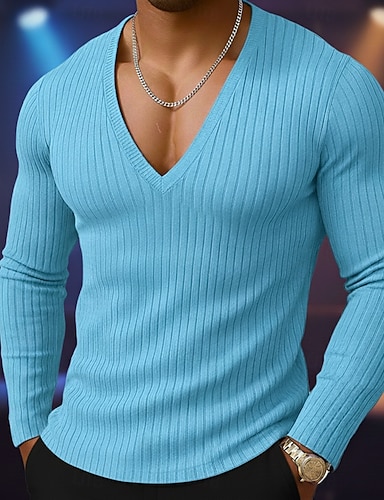 Муж. Футболка Трикотажная футболка в рубчик Рубашка с длинным рукавом Длинный рукав Глубокий V-образный вырез Весна Осень Зима Сплошной цвет Полотняное плетение Пит Стрип